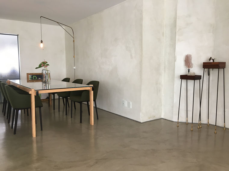 Os móveis foram criados especialmente para o apartamento. A mesa de jantar foi construída como um quebra-cabeças, com encaixes e conexões da madeira valorizadas. Também o bar se assemelha a um jogo de montar, com vários volumes e materiais sobrepostos e que abrem revelando seu interior. Uma poltrona em veludo rosa tem sua proporção esticada na largura, ocupando de forma ideal o espaço destinado para ela. Uma luminária pivotante foi criada para a sala de jantar, fixa à parede pode ser movimentada criando diferentes situações de luz. Na posição do lavabo criamos um bloco de madeira com aba que forma uma plataforma que se prolonga junto ao forro, sob ela um grande puff em couro caramelo. As paredes são pintadas em tons e texturas de concreto e receberam sutis e pontuais insetos e plantas pintadas à mão para serem descobertos aos poucos. O interior do lavabo foi todo revestido com motivos de flores e borboletas sobre fundo escuro, a cortina é uma sobreposição de várias camadas de tecidos de linho transparente em tons de rosa costurados à mão, criando uma luz filtrada e suave.